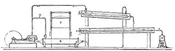 B, cast-iron shell containing chlorate of potash; A A', closed iron tube in which the gas is condensed; C, refrigerating cylinder in which liquid carbonic acid is volatilized; F, wooden case packed with some bad heat-conductor; D, reservoir holding liquid carbonic acid, surrounded by a refrigerating cylinder in which liquid sulphurous acid is volatilized; H, case packed with a bad heat-conductor; G, gasometer containing gaseous carbonic acid; K, reservoir for liquid sulphurous acid; P, one of the double-action pumps; A', cock which can be opened so as to give an exit to the liquefied gas which escapes in the direction shown by the arrows.
