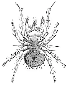 Fig. 8.—Cheyletus eruditus. and curved toward the wrist. Its cavities were swarming with a species of acari. Another species was found by Hering in the hind feet of a horse, that, although young and in other respects sound, had to be killed. The hoofs were quite disorganized, the frog and sole consisting of a soft, fibrous mass, secreting an offensive liquid; in the end, the sore spread to the flexors and muscles of the fetlock. A negro inmate of the Seaman's Hospital, London, suffered from large and peculiar sores on the soles of the feet. Examination by Prof. Busk revealed the presence of a mite, which was doubtless the cause of the trouble. The negro attributed the disease to wearing a pair of shoes which were lent for a few days to another negro who was similarly afflicted. The latter came from Sierra Leone, and inquiry proved the existence of a pustular disease, native to that place, called craw-craw, a species of itch very troublesome to cure.