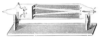 is an apparatus which will decide the question at once. The tube contains two negative terminals (a, b) close together at one end, and one positive terminal (c) at the other. This enables me to send two streams of radiant matter side by side along the phosphorescent screen, or, by disconnecting one negative pole, only one stream.