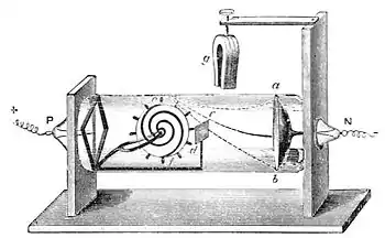 I have mentioned that the molecules of the radiant matter discharged from the negative pole are negatively electrified. It is probable that their velocity is owing to the mutual repulsion between the similarly electrified pole and the molecules. In less high vacua, such as you saw a few minutes ago (Fig. 16), the discharge passes from one pole to another, carrying an electric current, as if it were a flexible wire. Now it is of great interest to ascertain if the stream of radiant matter from the negative pole also carries a current. Here (Fig. 18)