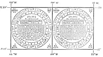 Now, a large number await examination—a rich mine of valuable material. A set of charts for the Pacific Ocean between the equator and latitude 45° north, and from the American coast to the 180th meridian, are the first fruits of labor in this mine. The complete set consists of fifteen different sheets: 1. Twelve on which the information peculiar to each month is given on a separate sheet; 2. One that summarizes all the observations of the direction and force of the wind of every month and year; 3. One that similarly gives all the observations of the barometer, thermometer, and weather; and, 4. One in colors showing the wind systems, stormy regions, and areas of equal heat and equal pressure—a graphical exhibit of what the other charts contain.