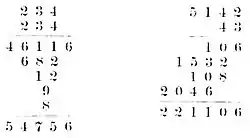 Though the multiplication-table was in use by the Arabians and Italians at an early date, no notice was taken of it during the middle ages in the rest of Europe. It may give us more charity for the boys and girls who are now wrestling with it—although nowadays it does not seem to require the struggle that it used to—to know that grown men, and wise men probably, sought for devices by which the labor might be avoided which we go through in childhood. Outside of Italy, many writers considered it necessary to relieve the memory from retaining the products of digits above five. The principal rule—known as the "sluggard's rule"—given for this purpose during the last half of the sixteenth century, the half century after the time of Luther, Melanchthon, and Erasmus, was this: Subtract each digit from ten, and write down the differences; multiply the differences together and add as many tens to their product as the first digit exceeds the second difference, or the second digit the first difference.