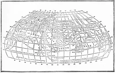 representation of it, and accordingly we are told that Crates (b. c. 326) constructed a globe of the inhabited part of the earth, from the Arctic to the Tropic, in the form of a half-circle. The zone about the tropics he represented as an uninhabitable portion, entirely covered by water (a belief which existed for a long time afterward), and the southern half beyond as that of an unknown but inhabited region. Dicearchus the Messinian (b. c. 296), a very accomplished man, and the writer of several geographical works, which are lost, constructed a map of the world in an oval form, which appears to have been highly estimated, and to have been the model upon which subsequent maps were made. It is inferable from passages in the classic writers that the maps in use represented the unknown parts of the world, in conformity to the ideas deeply implanted in the popular mind by the poems of Homer and