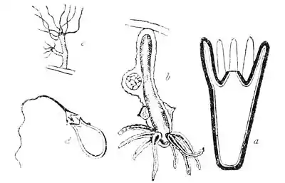 One species of this group, the brown Hydra (Hydra fusca), is common in stagnant waters and even in small garden basins. It has always excited the interest of naturalists and philosophers since Trembly made known its marvelous faculties. These Hydras ordinarily live solitary; but frequently the larger individuals are seen carrying smaller ones on the walls of their bodies. In a captured Hydra we can follow their development step by step. They are at first simple swellings,