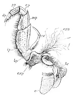 Fig. 1. Astactus fluvialilis.—The third or external maxillipede of the left side (x 3). e. lamina, and br, branchial filaments of the podobranchia; cxp, coxopodite; cxs, coxopoditic setæ; bp, basipodite; ex, exopodite; ip, ischiopodite; mp, meropodite; cp, carpopodite; pp, propodite; dp, dactylopodite.It is only when the mind passes beyond this condition that it begins to evolve science. When simple curiosity passes into the love of knowledge as such, and the gratification of the æsthetic sense of the beauty of completeness and accuracy seems more desirable than the easy indolence of ignorance; when the finding out of the causes of things becomes a source of joy, and he is accounted happy who is successful in the search, common knowledge passes into what our forefathers called natural history, whence there is but a step to that which used to be termed natural philosphy, and now passes by the name of physical science.