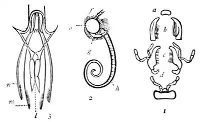 3. Mouth of a hemipterous insect (Nepa cinerea): l, labium; m, maxillæ; n, mandibles.