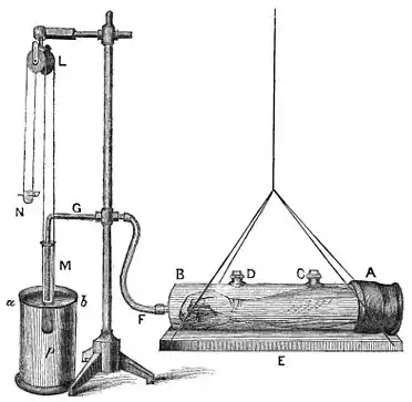 The test-tube M is so hung that its axis is traversed by the vertical descending limb of the glass tube G, and the test-tube can move up or down without striking the tube occupying its center.
