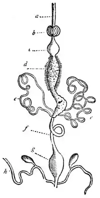 Fig. 7.—Digestive System of a Beetle (Carabus auratus): a, œsophagus; b, crop; c, gizzard; d, chylific stomach; e, Malpighian tubes; f, intestine; g, cloaca; h, supposed renal vessels. The human skin has powers of absorption, and in some slight degree a person may be fed through it. The continuation of the skin which lines the digestive canal is supplied with new powers of secretion; so that, instead of producing perspirations, oils, etc., it manufactures chemicals for changing food. Hence the principle of digestion and the character of the organs are fundamentally the same in all animals, the lowest with the highest. Only in the amoeba, hydra, etc., digestion is accomplished with the least possible expenditure.
