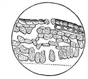 Fig. 6.—Cross-Section of a Leaf, showing the Cells containing Chlorophyl. bodies, sometimes closely packed together,sometimes scattered more sparsely. These little green bodies are the chlorophyl-granules, affording to our vegetation all the lovely tints which render charming a landscape in spring. Children of the light are these little green grains, lovers and worshipers of the sun. At all events, they appear by uncounted millions in the bright light of the open sky, become fewer and fewer in proportion as the light received by any plant is diminished, and finally disappear entirely when the plant is left in total darkness. Every one will recall the appearance of potato-stalks where growth has started in some dark corner of the cellar. Cells taken from such growth afford not a sign of chlorophyl. Botanists tell us that the petals of flowers are only altered leaves. In petal-cells, then, instead of chlorophyl-grains, we find in some cases granules of yellow, sometimes of orange. Sometimes the cell contains no such granules, but rather some colored fluid, red, blue, or purple, and then our flowers are tinted accordingly; sometimes the cells of a petal contain air only, and then the flower is white. But these tiny green grains in the leaf-cells do vastly more than simply lend their color to the foliage; they are readjusters and organizers, and perform, in those diminutive laboratories we have been calling cells, feats which the chemist strives in vain to rival. They take possession of molecules of carbon dioxide and of water, compel the binding chemical forces to relax their hold, combine again, to serve the purposes of the plant, the atoms of carbon, of hydrogen, using such part of the oxygen as may be necessary, and setting the remainder free in the open atmosphere—all this in the sunlight. The chlorophyl bodies thus work while it is day, have charge of nearly all the income of the plant, and provide in themselves for the temporary storage, of its daily accumulations, mostly in the form of starch. When the night comes, these same little factors give up at once their labors and their stores, other cells of the plant begin to work, change and transfer and change again, until all the wondrous series of vegetable products with which we are familiar (the sugars, the oils, the alkaloids, crystals of various forms and kinds) are formed and properly deposited. We might go on now to examine cells containing many of these sub-