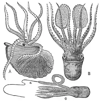 Fig. 4.—Paper Nautilus. A, female argonaut showing shell, around which the two expanded arms are clasped; B, female removed from shell; C, the male argonaut (shell-less).