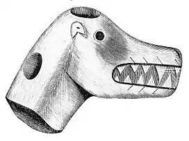 limestone. It is very highly polished, and considerable skill is exhibited in the carving of the head. It is evidently meant for a wolf, and the teeth, though interlocking in a peculiar way, are still tolerably true to nature in having the long canines.[2]