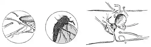 time so much excited as to have quite lost their spherical form, are inserted between the joints about the head, and among the hairs of the feet and legs (as in Figs. 5, 6, 7), the stronger members being firmly pinioned by the stronger tentacles (as Fig. 8), while the small hairs are discharging their fluid. This fluid seems to be somewhat tenacious.