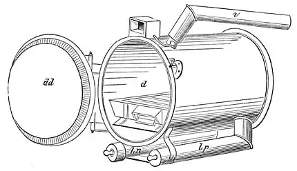 It is shown open and out of its setting in Fig. 1, and there seen as a hollow cylinder of sheet-iron, which for ordinary use may be about eighteen inches in diameter and twenty-four inches long, closed per-