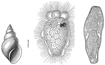 while it remains within the infested sheep. The eggs are, however, naturally washed away by the bile into the intestines, and finally pass from the sheep and are distributed with the droppings. If the eggs fall upon wet land, further changes take place during warm weather, and an embryo is formed. Fig. 3 shows a fluke-egg with the embryo fully formed within the shell. The body of the embryo is covered with cilia, by the motion of which the young trematode is propelled through the water. Both of the engravings (Figs. 3 and 4) are highly magnified. In swimming, the broader end is directed forward, and in its center is a projection, used as a boring-tool. The embryo has very simple eye-spots, which render it sensitive to light, and aid it in finding its future home. When the swimming embryo comes in contact with any object, it feels about, and, if not suited to its wants, starts off again. If the object met with is the snail (Limnæus truncatulus), shown in Fig. 5, it at once bores into it. In boring through the shell of the snail, the peg-like projection is extended, and the embryo spins around rapidly by means of the cilia. The natural place for the further growth of the embryo is in or near the lung of the snail, and when once lodged there its eye-spots and cilia disappear, and the body becomes oval in shape. Figure 6 shows the embryo while the changes are taking place. When the changes are completed the animal is called a sporocyst, meaning a sac of germs. The sporocysts live at the expense of the snail, and will, in July weather, reach their full growth, 1⁄40 of an inch, in a fortnight. Fig. 7 shows a full-grown