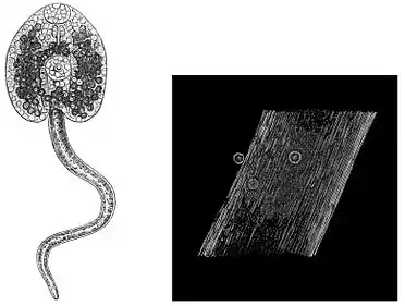 The summary of the life-history of the liver-fluke is given as follows: "The adult fluke in the liver of the sheep produces enormous numbers of eggs, which are distributed with the droppings of the sheep. If these eggs have moisture and a suitable degree of warmth, they continue to live, and in each is formed an embryo. The embryo leaves the egg and swims in search of the particular snail (Limnæus truncatulus) within which its future life and growth take place. The embryo bores into the snail, and then grows into the form which is called a sporocyst. The sporocyst gives rise to the second generation. This generation is known as the redia. The rediæ in turn produce the third generation, which has the form of a tadpole, and is called cercaria. The cercaria? quit the snail and inclose themselves in envelopes or cysts, which are attached to the grass. When the grass to which the cysts adhere is eaten by sheep or other suitable hosts, the young liver-fluke comes out of the cyst and takes up its abode in the liver of its host, and the fatal circle is thus completed."