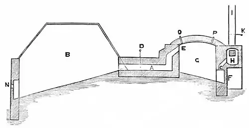 coating, with a slight slope toward the walls, in order that the rain-water may run off. The opening, F, in the front wall should be closed with a thin wall of plaster of Paris. The ore in the kiln, which is now ready for fusion, is put in communication with the spent calcarone, B, by opening the damper, D, and at the same time a small hole, N, is made in the wall that closes the opening in front, from which the melted sulphur has been run off from the calcarone, B. The current of air entering by the hole, N, and passing through the incandescent mass of ore, is thus heated, and enters the kiln by the flue, N, at a sufficient temperature. In this manner the heated mass of spent ore in the calcarone becomes a regenerator of heat, to be utilized in the kiln for the fusion of the sulphur that it contains. In the upper covering, two or more tubes, O P, are placed, and serve not only for observing the internal temperature by a thermometer, but also for firing the mass.