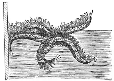 The common star-fish usually crawls in a determinate direction, the feet on the tip of the foremost ray being used as feelers. In a tank, when the star-fish has ascended the side and reaches the surface of the water, it often performs peculiar movements which may be called acrobatic. The animal does not wish to leave its native element—in fact, can not do so, because its sucking feet can act only under water—neither does it wish to descend at once.
