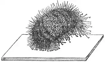 perpendicular surfaces, and when inverted right themselves as quickly as do the unmutilated creatures. A segment of an echinus bearing a single row of ambulacral feet, when propped up on its ab-oral pole, (Fig. 11) will right itself after the manner of entire animals (Fig. 12). It, however, experiences more difficulty in doing so, and very often fails to complete the manœuvre. Such a segment is, of course, analogous to a single detached ray of a star-fish; but on account of the rigid consistence and awkward shape of the segment—standing erect instead of lying flat—it presents a much more curious appearance in locomotion than does the ray of a star-fish.