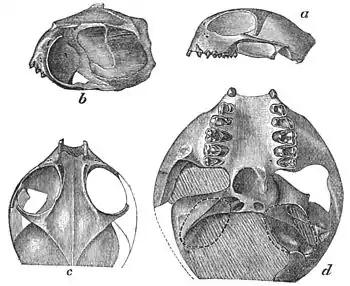 Fig. 2.—Skull of the Primitive Lemur (Anaptomorphus homunculus) (Cope). Natural size, except Fig. d, which is four thirds natural size. (From the Eocene of Wyoming.