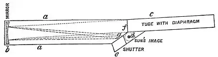 The small plane speculum and the arm carrying it were removed. The open end of the tube is fitted with a mahogany cover. In this cover at one side is a circular hole, f, three and a quarter inches diameter, for the light to enter; below is a similar hole over which is fitted a framework to receive the "backs" containing the photographic plates, and also to receive a frame with fine-ground glass for putting the apparatus into position. Immediately below, toward the speculum, is fixed a shutter with an opening of adjustable width, which can be made to pass across more or less rapidly by the use of India-rubber bands of different degrees of strength. In front of the opening f is fixed a tube, c, six feet long, fitted with diaphragms, to restrict as far as possible the light which enters the telescope to that which comes from the sun and the sky immediately around it. The telescope-tube a, a, is also fitted with diaphragms, which are not shown in the diagram, to keep from the plate all light, except that coming directly from the speculum. It is obvious that, when the sun's light entering the tube at f falls upon the central part of the speculum, the image of the sun will be formed in the middle of the second opening at d, about two inches from the position it would take if the tube were directed axially to the sun. The exquisite definition of the photographic images of the sun shows, as was to be expected, that this small deviation from the axial direction, two inches in seven feet, does not affect sensibly the performance of the mirror. The whole apparatus is firmly strapped on to the refractor of the equatorial in my observatory, and carried with it by the clock-motion.