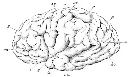 Fig. 1. Fissures and Convolutions of the Human Brain. (Wundt.) Left side. S, Sylvian fissure—s, perpendicular, s'. horizontal, branches of this fissure; R, fissure of Rolando; E, external perpendicular fissure; F3, third frontal convolution or convolution of Broca; AF, ascending frontal convolution; AP, ascending parietal convolution; AG, angular gyrus or pli courbe; F, frontal lobe; P, parietal lobe; T.S, temporo-sphenoidal lobe; O, occipital lobe.