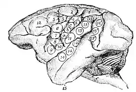 Fig. 2.—Lateral Aspect of Monkey's Brain, showing the relative positions of the so-called "Motor Centers" in the left Cerebral Hemisphere. Ferrier. to English readers, has special merit in two respects. It displays a very intelligent comprehension of the consequences of electrical stimulation, and seems to give a juster account of the motor regions in the monkey's brain than was furnished by Hitzig.