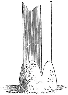 Fig. 3.—Foundation-Stone. It was, indeed, like a beautiful cabinet, though disfigured by a bright-colored foreign carpet upon its lower floor. The uprights of this structure rested on large, oval, beach-worn stones buried end-wise in the ground; and, upon the smooth rounded portions of the stones, which projected above the level of the ground to a height of ten inches or more, the uprights had been most accurately fitted (Fig. 3). The effect was extremely light and buoyant, though apparently insecure to the last degree; yet this building had not only withstood a number of earthquake-shocks, but also the strain of severe typhoons, which during the summer months sweep over Japan with such violence. If the building be very small, then the frame consists of four corner-posts running to the roof. In dwellings having a frontage of two or more rooms, other uprights occur between the corner-posts. As the rooms increase in number through the house, uprights come in the corners of the rooms, against which the sliding-screens, or fusuma, abut. The passage of these uprights through the room to the roof above gives a solid constructive appearance to the house. When a house has a veranda—and nearly every