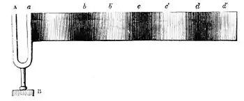 each musical note. Savart employed a toothed wheel, which could be set in motion at any desired rate of speed, and which had attached a small recording apparatus that gave the number of revolutions in a second. Fig. 7 represents the mechanism, and the mode of using it. While the wheel is in revolution, a thin visiting-card, or a piece of pasteboard, is held against its toothed edge. The card is bent a little by each tooth, as it goes by, and springs back to its first position as soon as it is released. When the wheel is turned slowly, there is heard only a succession of taps, distinctly separable one from another; but, as the rapidity of the rotations increases, the number of strokes increases also, and they soon unite to form a musical sound, while, exactly as the motion is accelerated, the sound rises in pitch. In this way it is possible to count the number of vibrations in producing every note in the musical scale.