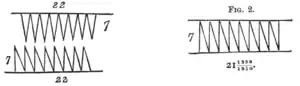 The explanation of the method of finding the area of the circle is somewhat indirect, and is likewise ingenious. The circle is divided into two semicircles by a diameter: if this diameter is 14, the semi-circumference is equal to 2112391250. Suppose a number of radii drawn, and the semi-circumference developed into a right line; each half of the circle will become a saw-shaped figure (Fig. 1); placing these
