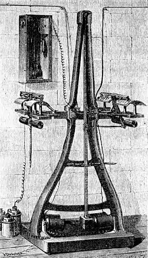 ink in winch the dispatch is written, the circuit ABCD is broken, and the current travels through the line-wire. At this moment the style on the sheet R is in exactly the same position as that on the sheet M, by reason of the synchronism of the pendulums, and a blue line will