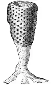 Ventriculites Simplex.—A fossil sponge, one and a half the natural size, showing the surface ornamented by a regular arrangement of ventricles. (See Fig. 10.)