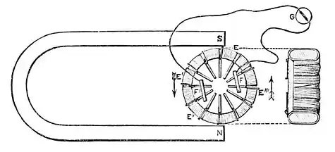 Submit this annular electro-magnet simultaneously to the influence of the two poles of the permanent horseshoe magnet, N S, and at the same time imagine it to revolve on its axis in the direction shown by the arrows.