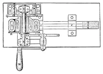 The friction-pieces F (Figs. 4, 5, and 6), consisting of disks of copper, are pressed, by means of springs shown at r (Figs. 5 and 6), against the circle formed by the extremities of the conducting radii R, at two points which are accurately in the equatorial line; that is to say, at