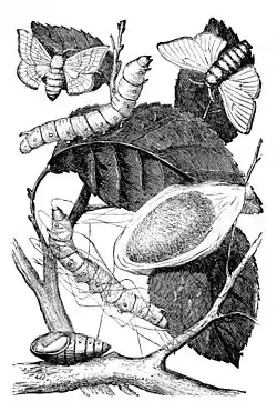 Larva, Pupa, Cocoon, and Moth, of Silk-worm.