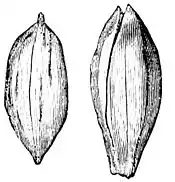 Fig. 9.—Pecan (Carya olivæfarmis). to eleven, and in others fifteen to twenty-one), and by having its catkins separated at the base instead of being united. And it agrees with the hickories in having three catkins instead of one, and by the husk of the fruit separating into four pieces. The kernel is very sweet, the husk is thin, and the nut smooth and rather thin-shelled. The peculiar feature of a bitter division between the two halves of the nut is an approach to those hickories having a bitter kernel: while the hard shell and the sweet kernel ally it to the shell-bark. The tree is confined now to the States near or bordering the Mississippi River, and is thus the nearest of all the species to that spot which was once thickly clothed by its ancestors. It is noteworthy, too, that the walnuts approach the same habitat, and in the case of one species extend across the continent to California.