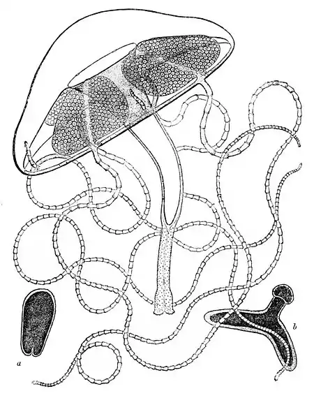 Fig. 2.Liriope scutigera, slightly magnified, drawn from Nature by W. K. Brooks. (The small figure in the left-hand lower corner is the planula of Turritopsis, greatly magnified; and the one in the right-hand corner, the root and the first bud of the Turritopsis hydroid.