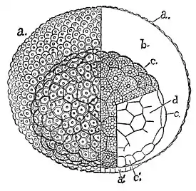 Fig. 3.—Planula of Liriope scutigera, highly magnified, drawn from Nature by W. K. Brooks: a, surface layer of cells, which is shown in section on the right half; b, gelatinous substance; c, inner layer of cells, shown in section in the lower right-hand quadrant; d, the central cavity; a', the point where the month is to be formed. it no sooner begins its own independent life than it produces buds which are ultimately set free, as jelly-fish like the parent, each of which soon becomes a mature male or female. The eggs are thrown out into the water, where they are fertilized by union with the male cells, and each egg then begins the process of development, which is to result in the founding of a new hydroid colony. The life of the jelly-fish is very short, and simply serves to multiply the species, and to scatter the eggs far and wide along the shore of the ocean, and thus to secure the wide distribution of the hydroids. The egg hatches, however, neither into a jelly-fish like the parent, nor into a hydra, but into a minute microscopic animal of extremely simple structure, which is known as a planula. Fig. 2, a, which is a highly magnified drawing of the planula of another species, will serve to show what it is like. It has no mouth nor tentacles, and its pear-shaped body is covered with cilia, by means of which it swims slowly through the water for a short time, but, unless its slight locomotor power soon brings it into