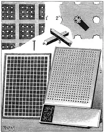 finger of the blind man. It has not been found convenient for writing, but has been applied with advantage to the drawing of geometrical figures, and for maps. Some of the most successful maps have been prepared by M. Trouillard, who uses linoleum, and indicates the rivers by iron wires, and mountains by more or less prominent undulations. The place of each city, the name of which is indicated by the initial letter in "Braille," is marked by a peg split at the top. A thread attached to the point that indi-