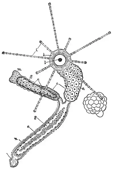 this ancestor, the conditions of life became more and more favorable for the larvæ, and as successive generations of larvae became more and more adapted to these conditions, the larval life gradually increased in length and importance, and threw the adult sexual stage more and more into the background, until, in the case of Dysmorphosa, we have a colony of long-lived larvæ, which embody all that is most distinctive and characteristic of the species.