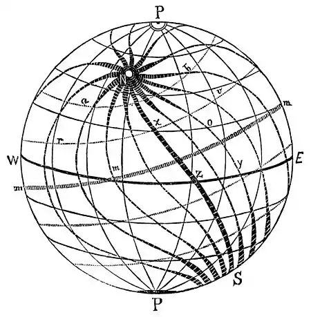 The lines issuing from one pole to meet again in the other are called lines of equal variation; that is, a compass carried along one of them from north to south would always point at the same