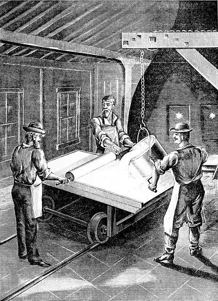 until a large bubble of air is formed in the midst of the mass; then, with alternate blowing and manipulating, he so increases the size of the bubble that the ball of glass assumes a shape not unlike that of the large carboys used in the transportation of