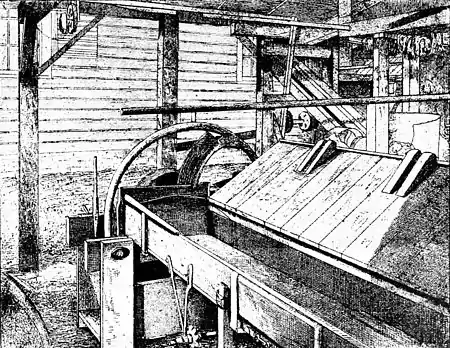 The beet-roots are dumped, by the farmers, into large bins about nine hundred feet long, capable of holding five thousand tons of beets, from which they are dropped by adjustable traps into a concrete ditch or canal, underneath the beet-house. This canal is provided with descents of brickwork or metal gutters, through which the roots are borne by the, rushing water into the wash-house, which constitutes the first stage of the factory. In the wash-house is a large screw or raising wheel arrangement, by which the beets are emptied into a hopper on the second floor.