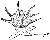 Fig. 2 represents a shell-bearing amoeba (Euglypha), which is also to be found in great numbers in the mud of wells. In this organism the naked sarcode, which consists of a substance similar to albumen, is covered and protected by a membranous envelope, or "carapace," from which, through an opening, the pseudopodia (ps) appear. The little organism pictured in Fig. 3 stands in close relationship to the preceding (Centropyxis aculeata.) Its shell, made up of diatoms and fragments of small particles of stone, shows thorn-like protuberances.