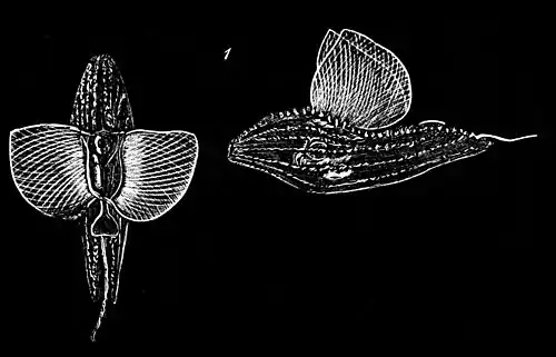and a brownish kernel about the size of a grain of wheat; only on a closer inspection can we distinguish two large, roundish wings, as clear as glass, that sit upon a yellowish body drawn backward in length, that rests in a crystal boat, the contour of which can not be exactly discerned, because the substance of which it is formed has the same refractive power as water. It is only when the animal is put, hardly covered with water, in a flat saucer of glass, against a black ground, that we can see the figure
