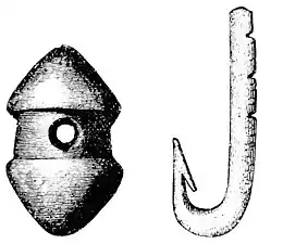 Fig. 5.—Amber Bead. Fig. 6.—Bone Fish-hook. The manner in which such a pebble could be used for the work was demonstrated to an Englishman some time ago by an Indian arrow-maker in California. The long and narrow barbs in the fine arrow-heads (Fig. 2) and saw-teeth (Fig. 3) were obtained probably by the pressure of a bone tool, such as is still used by some American tribes. Holes were bored, where needed, by twirling a stick, hard pressed upon, against the spot where the perforation was to be. It took a long time, but primitive men had time. Most of the tools were only chipped, while others were polished or ground. The grindstone was usually a suitable block of sandstone, or else a thick piece of the same material. One of these pieces, which has been worn down in the middle by use, is represented by Fig. 4. Handles, if the instruments were provided with them, were inserted into