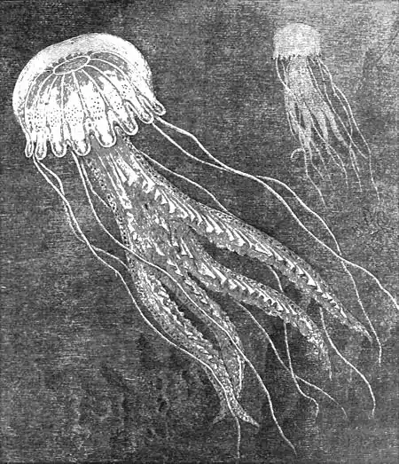 Like the Physalia in general structure, and in the fact that they possess stinging cells, are the jelly-fishes, which are present in the Gulf Stream in a great abundance of forms. There are