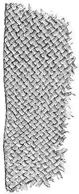 Fig. 4.—Piece of Woolen Stuff of the Bronze Age. the casting. The non-socketed celts were fixed, like the flint axes, into one end of a cloven haft. "Of sewing implements there have been found especially needles, awls, tweezers, and knives. They are almost always of bronze; but a few tweezers and one awl of gold have been found in Sweden and Denmark." The awls were fixed in a haft, of which specimens made of bronze, bone, and amber are preserved. The needles were used in making woolen clothes, and the other implements for sewing leather or skins. Narrow strips or threads of skin were cut out with the knife, holes were bored with the awl, and the leather thread was drawn through the holes with the tweezers. "These implements are much more frequent than the needles, which partially indicates that clothes of skin were far more generally worn than those of wool during this period." Scissors were unknown.