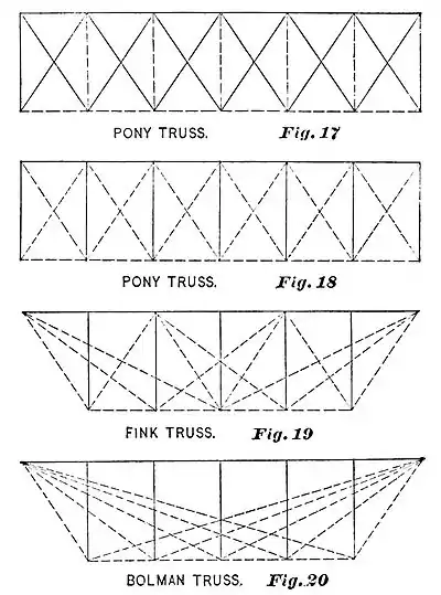 In the pony truss, the only distinctive feature is that the trusses are not deep enough to allow of their being fastened together across the top, when the train runs through upon the bottom chord, and therefore they can only be used for very short