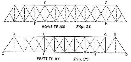 The brace or strut is a compression member, and may be either vertical or inclined (E F, Figs. 21 and 22), the object of which is to keep the two chords apart. The tie is a tension member, and also may be either vertical or inclined (G H, Figs. 21 and 22). The lower chord being always in tension is sometimes called the straining piece.