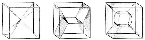 With No. 2 still on the frame, dip it again into the suds. You catch a bubble by doing this which goes at once to the center (Fig. 3), and forms such a cube as existed at the center of Fig. 1,